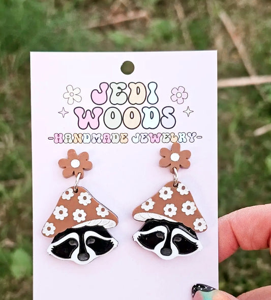 Cottage Core Mushroom Hat Raccoon Earrings - Studs Style Top