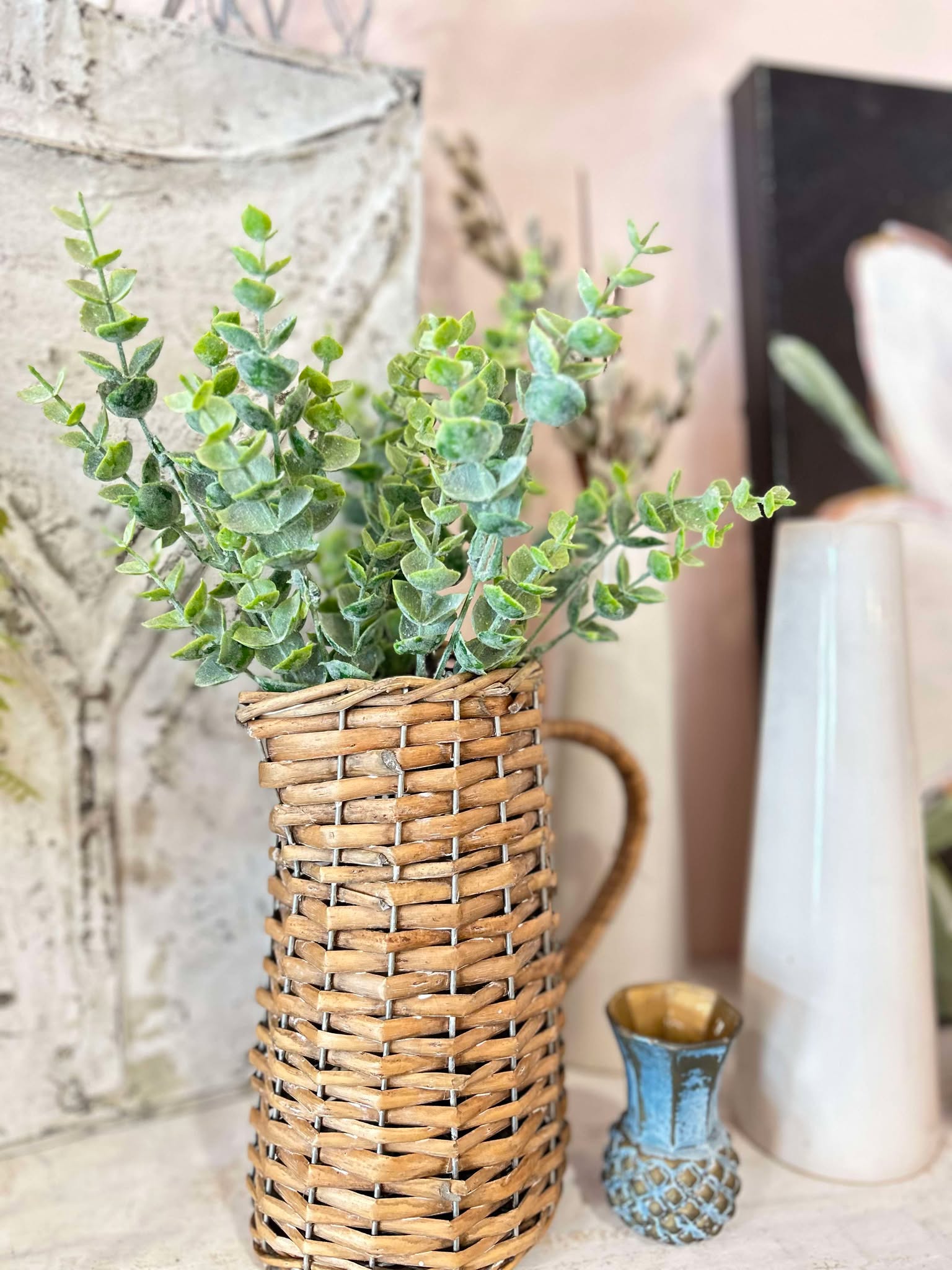 Add some greenery to your space with our 14" faux eucalyptus bunch. No need to worry about watering or wilting, this bunch will bring a touch of nature to your home without any maintenance. Perfect for adding a pop of color and freshness to any room.