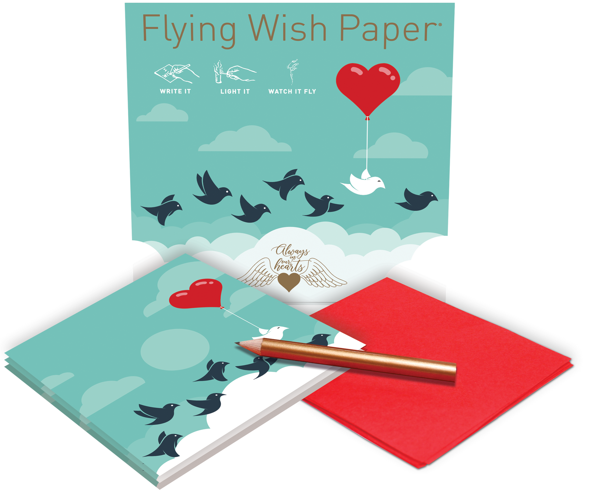 “Always in Our Hearts” design for Flying Wish Paper® presents a poignant motif of eternal hearts and subtle floral accents on specially crafted intention papers, evoking a timeless sense of remembrance and enduring connection with soft tones that convey serenity and comfort. Its purpose is to facilitate gentle intention-setting rituals for honoring loved ones, releasing emotions, or marking memorials, where users write heartfelt messages or prayers, light the paper, and watch it ascend as a symbol of lasting love and peace—ideal for grief support, spiritual reflection, or quiet healing moments. This emotionally resonant design stands as a compassionate bestseller, offering retailers the opportunity to provide meaningful support.
