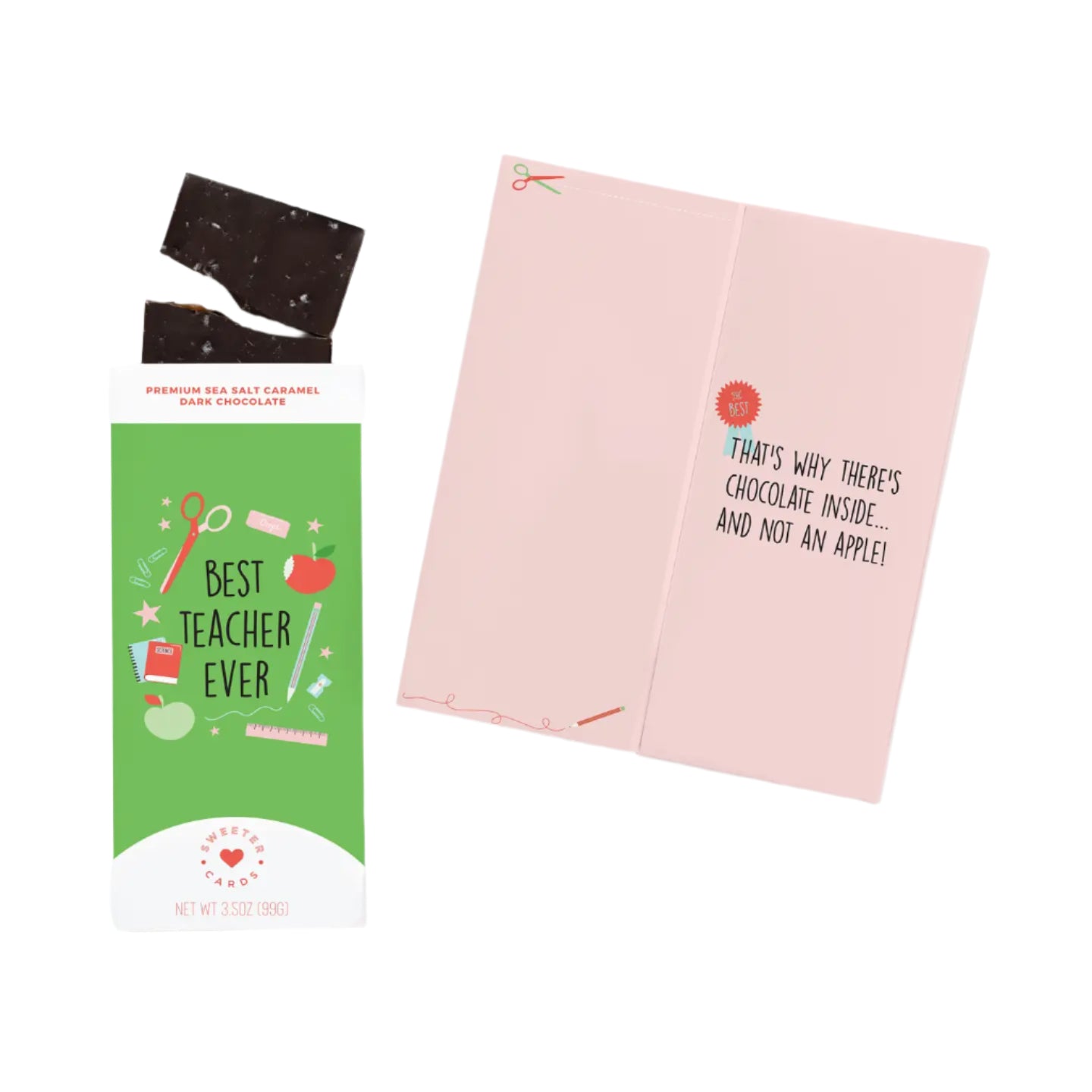 Sweeter Cards is the first-ever greeting card and chocolate bar ALL IN ONE, featured in The New York Times, Good Housekeeping, Food Network and more. The "Best Teacher Ever" card is the perfect end of the year gift for your favorite teacher. The sea salt caramel dark chocolate is unreal.