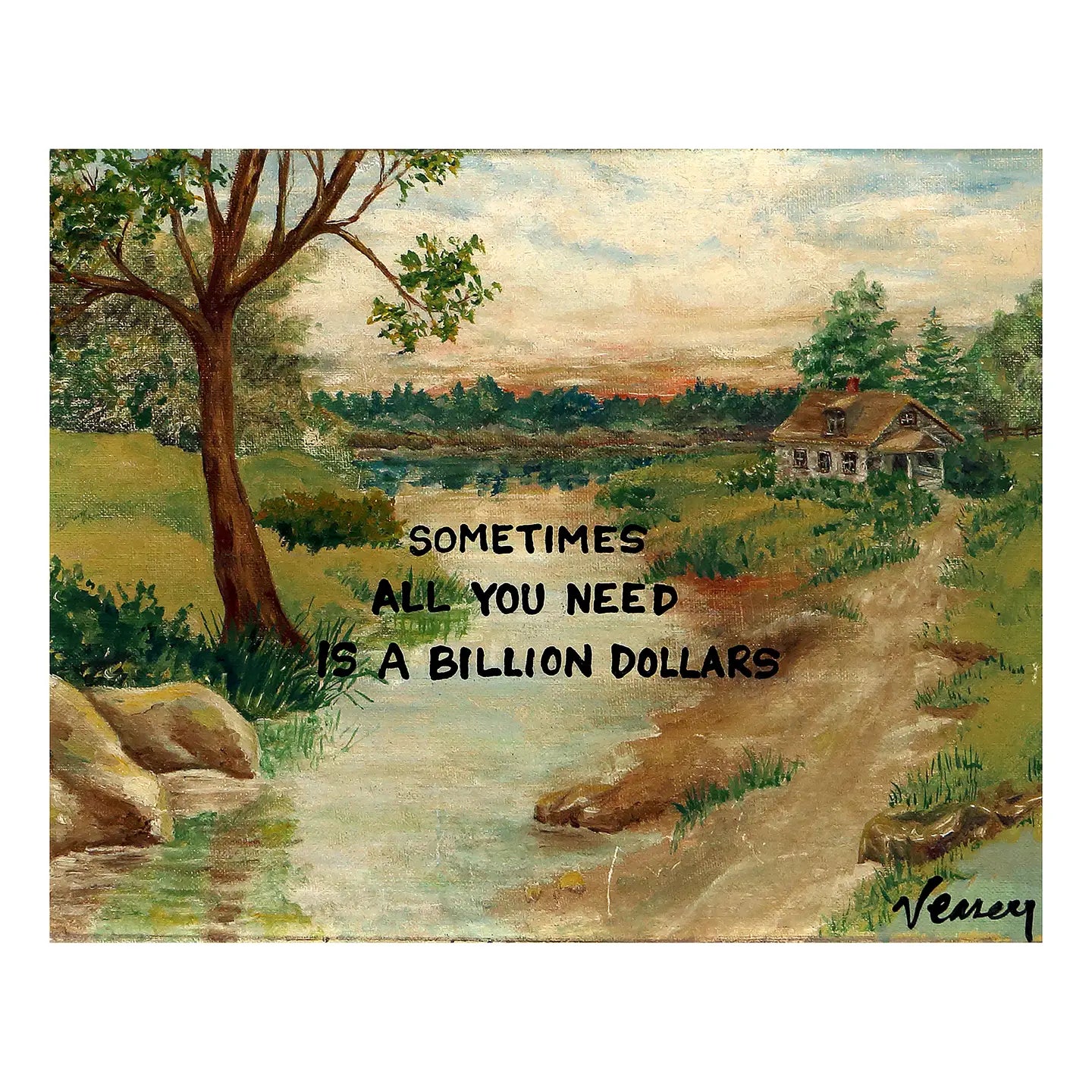 Add a touch of whimsy to your space with the Billion Dollars Print. Featuring a charming cottage by a serene stream and the cheeky phrase "Sometimes All You Need is a Billion Dollars," this 8 x 10 artwork is printed on matte premium photo paper with archival ink for lasting quality. Ships unframed and protected in a clear acetate sleeve between sturdy cardboard, it’s perfect for gallery walls or gifting to art lovers with a playful flair and big dreams.