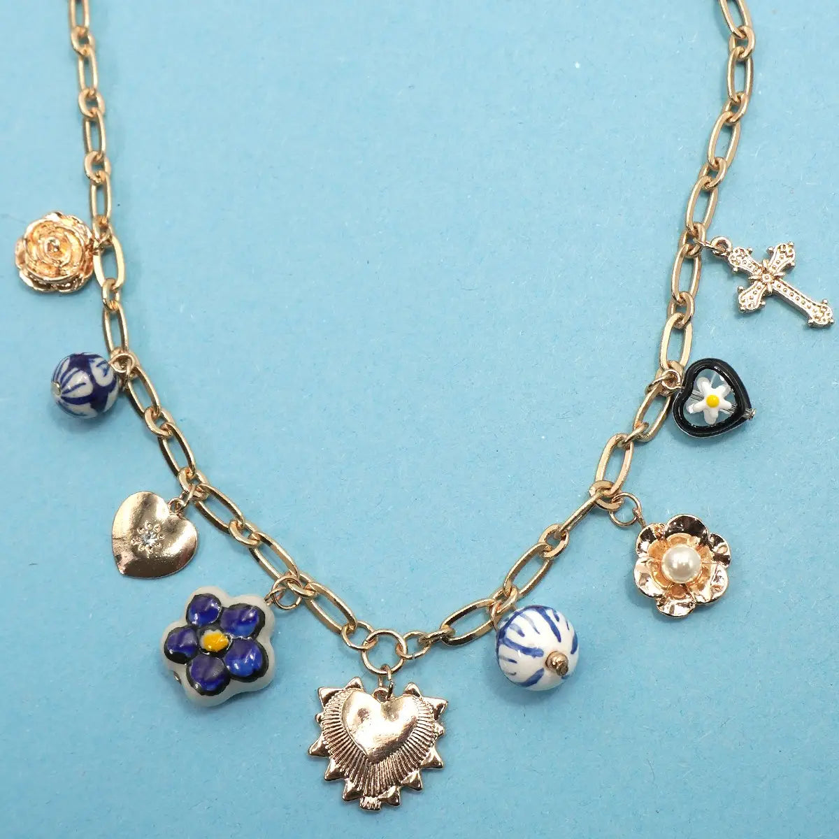 Add a playful touch to your look with this Blue Ceramic Porcelain Charm Necklace. Featuring a delightful mix of ceramic porcelain toile pattern charms alongside flower, ball, heart, and cross charms, all hanging from a gold-plated link chain. At 16" with a 3" extender, it’s perfect for layering or wearing solo. Secure with a lobster claw clasp and enjoy lasting shine thanks to the double E-coating that protects against tarnish. Lead and nickel compliant for worry-free style.