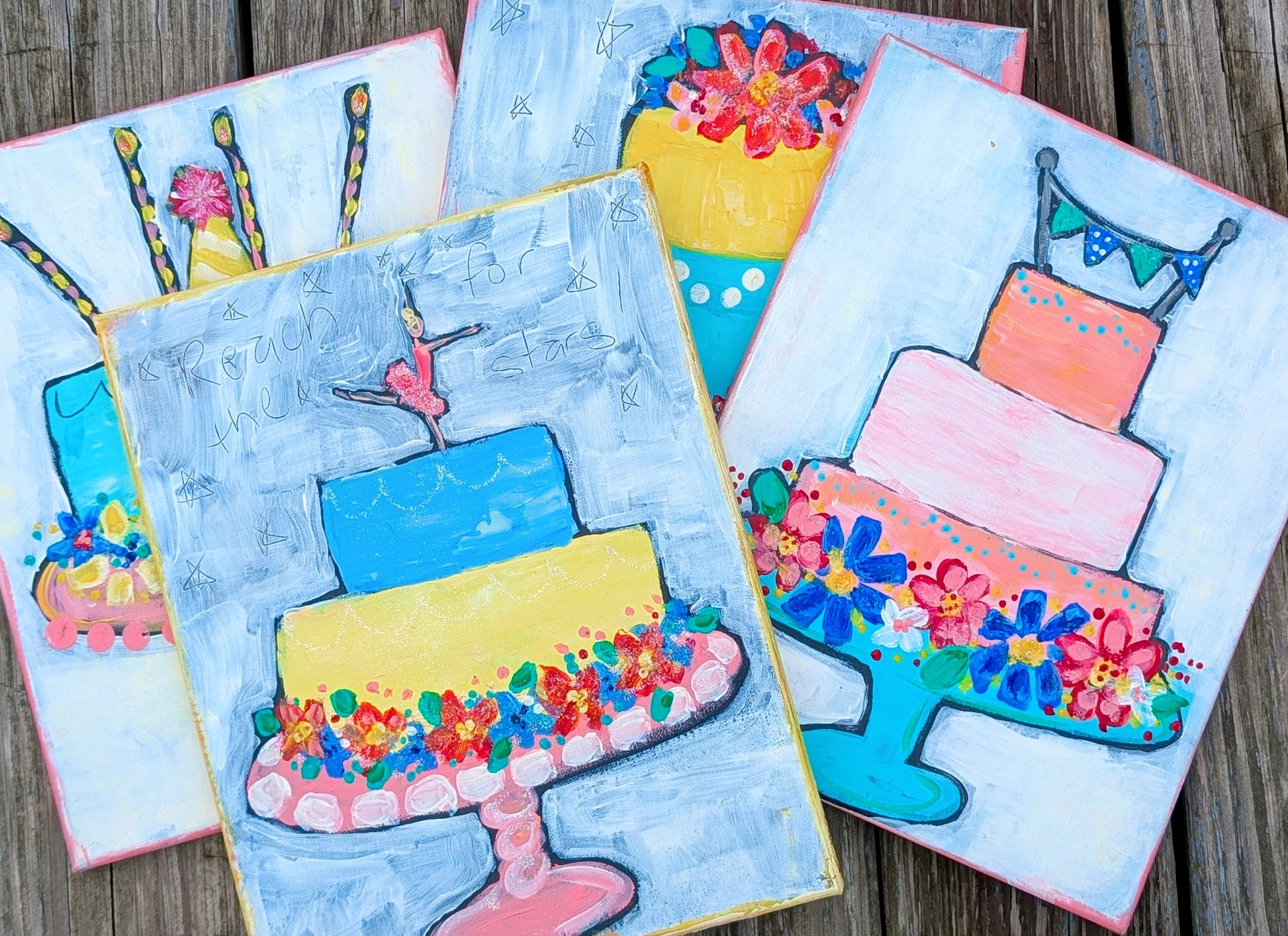 These cakes are painted in canvas, with thick acrylic paints and enhanced with clear sparkles.