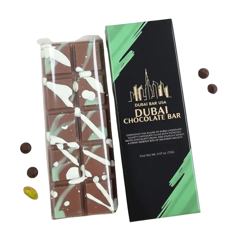 Get ready to treat your taste buds with the Dubai Chocolate Bar – Pistachio! Crafted by Dubai Bar USA, this playful blend of rich chocolate, crunchy kataifi pastry, and creamy pistachio butter delivers a fun, luxurious crunch in every bite. Proudly made by America’s top Dubai chocolate producer, each bar promises a deliciously unique experience that’s as eye-catching as it is unforgettable. Indulge in a snack that’s seriously tasty and seriously fun!