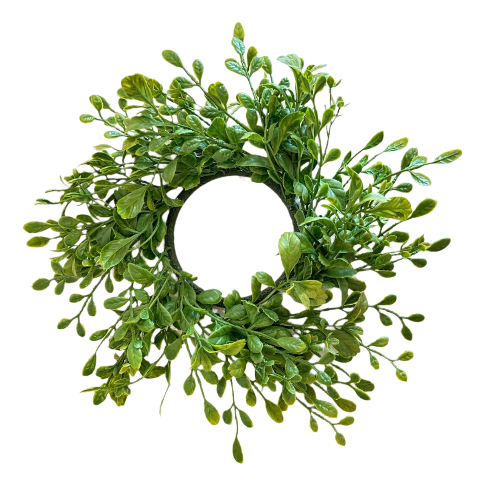 Elevate your home decor with our English Boxwood Candle Ring! Made with faux boxwood, it adds a touch of spring to any space. Pair it with our Faux Bird's Nest for a playful and unique look. Can also be used as a wreath! Light up your home with style and whimsy!