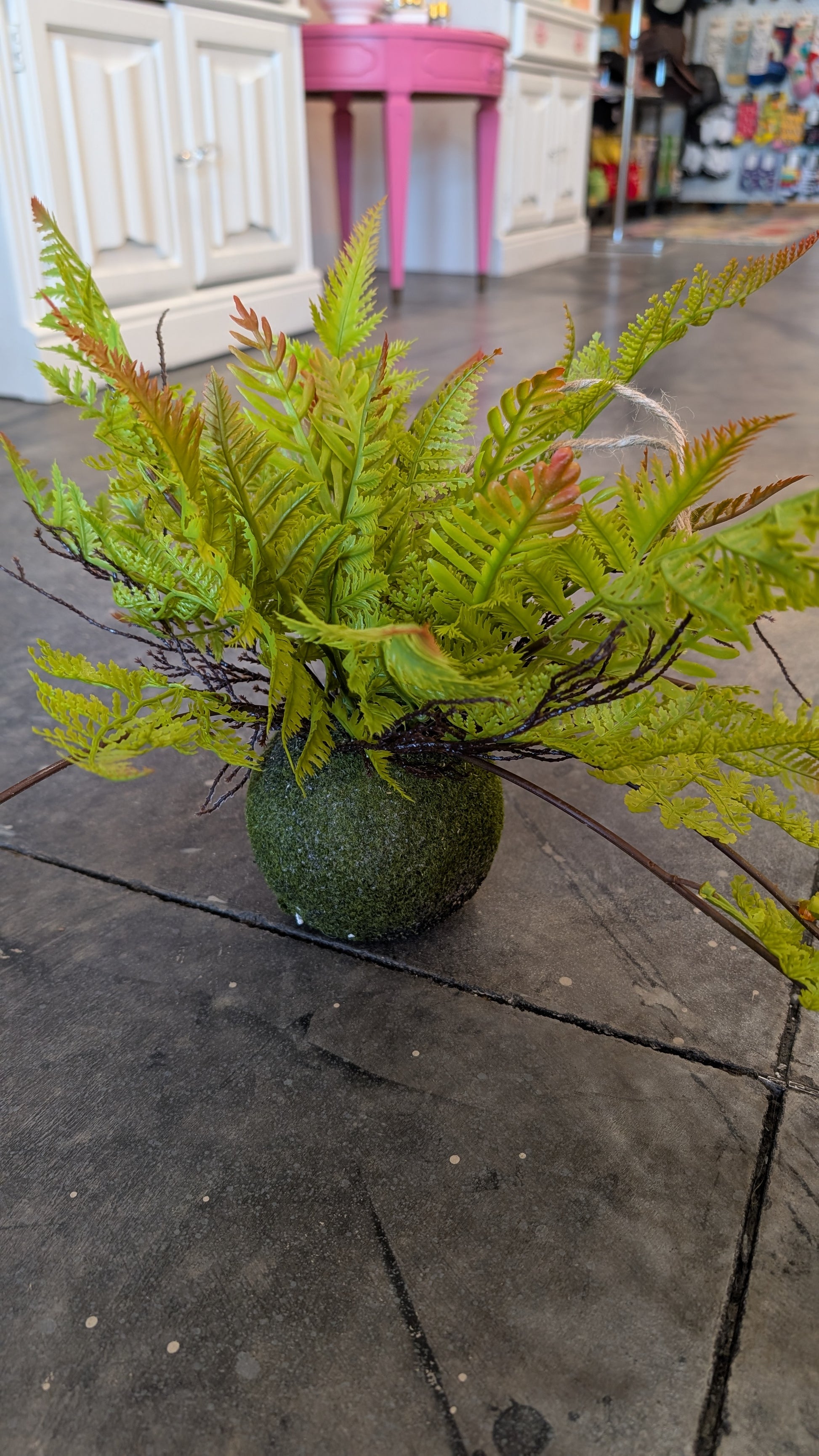 A kokedama ball is a ball of moss with a plant, especially a fern, which is a Japanese art form of growing plants in a moss-covered ball of soil.