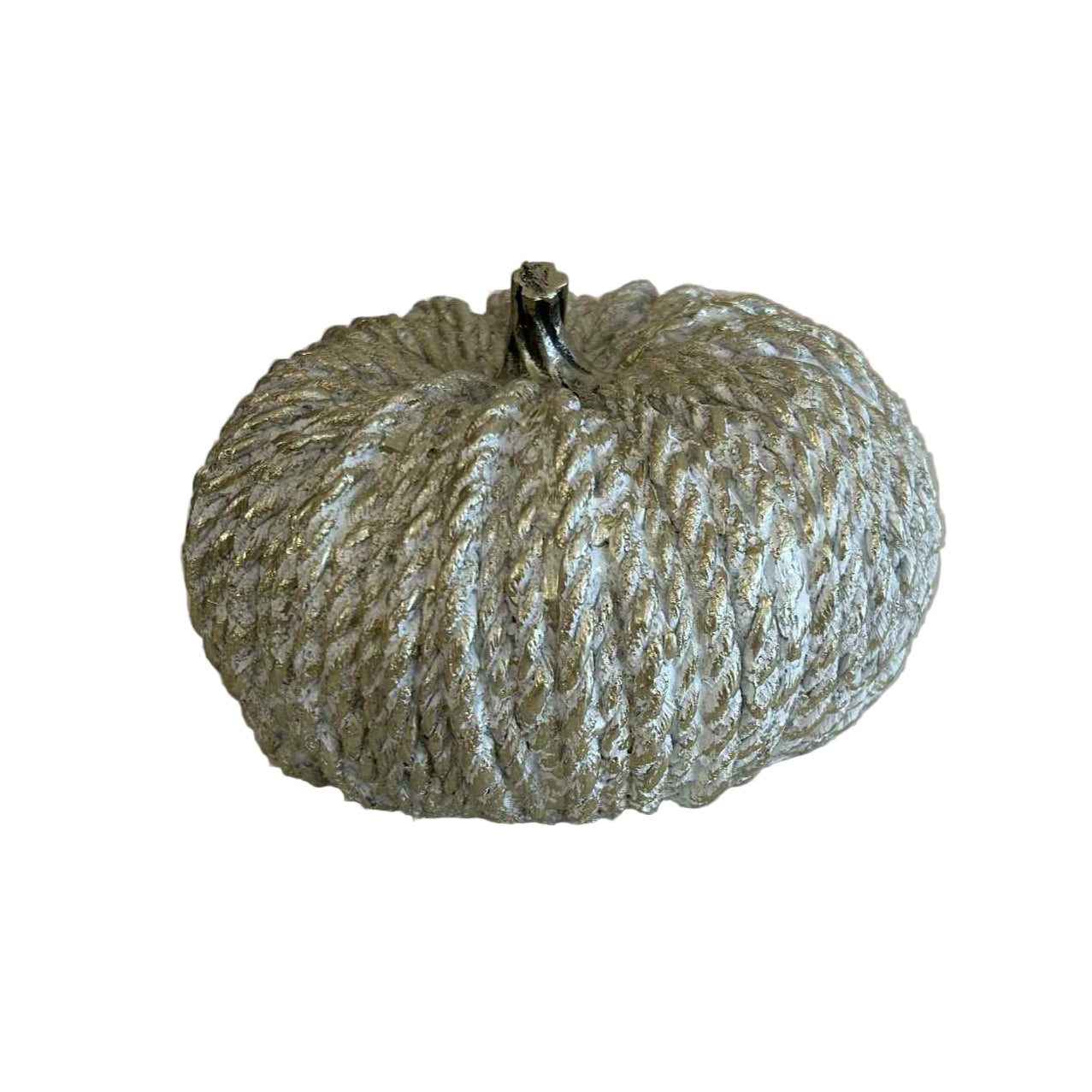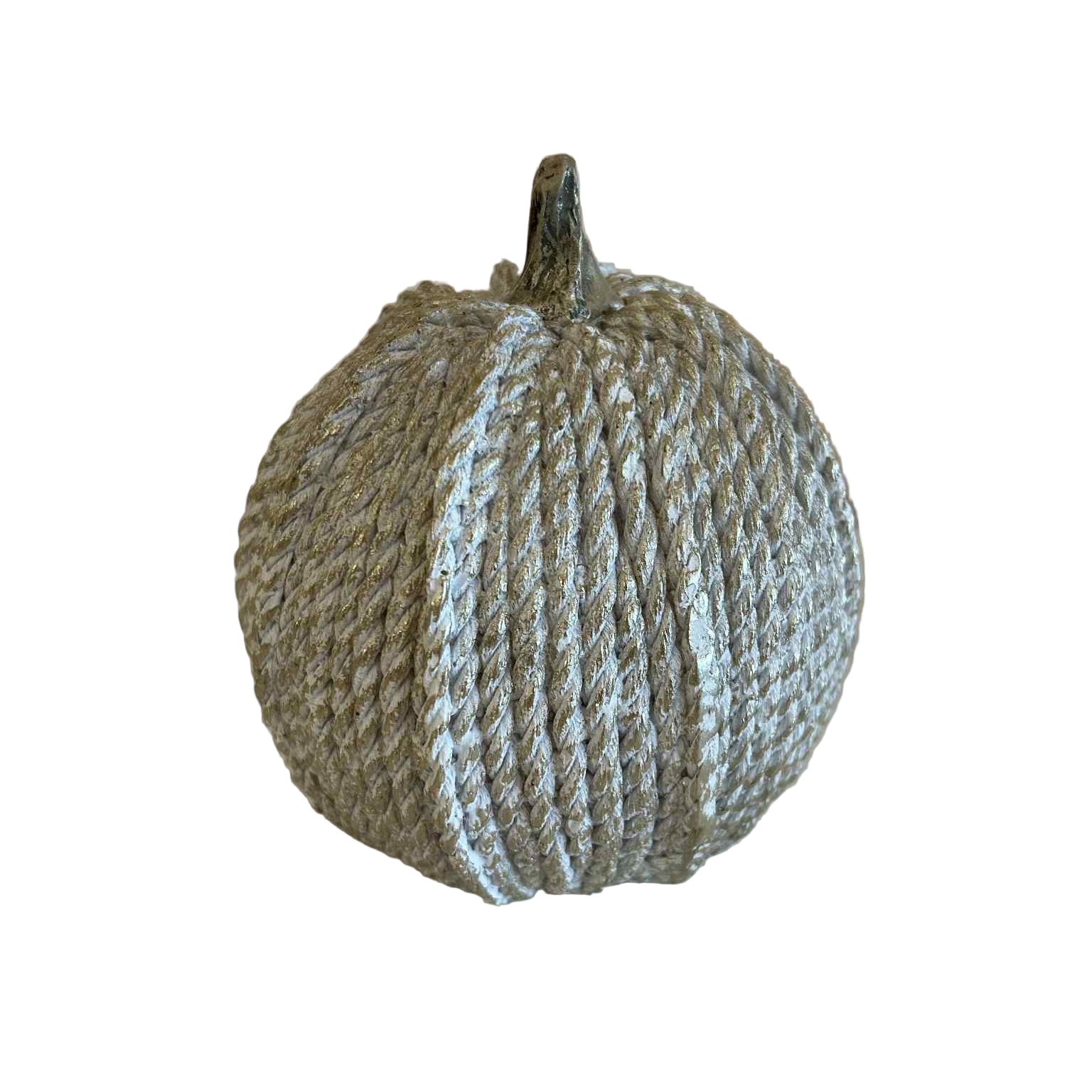 Celebrate the season with this charming Flat Rope Resin Pumpkin, crafted in white resin with a braided rope texture for a cozy, handwoven feel. Finished with a subtle gold metallic lightwash, it adds a warm, festive glow to your fall decor. Perfect for bringing playful autumn vibes to any space, this pumpkin blends rustic charm with elegant sparkle.