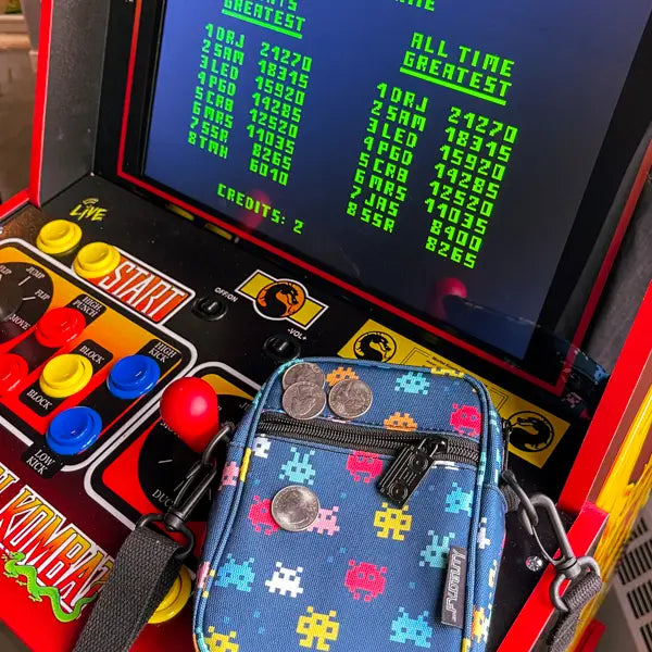 Made from 100% post-consumer recycled rPET polyester, this bag is a true green machine! Sublimation printed with the retro space defender design. Adjustable cross body strap. Organize everything from your backstage passes to your secret stash with multiple pocket options. Dimensions: 8" x 6" x 2"
