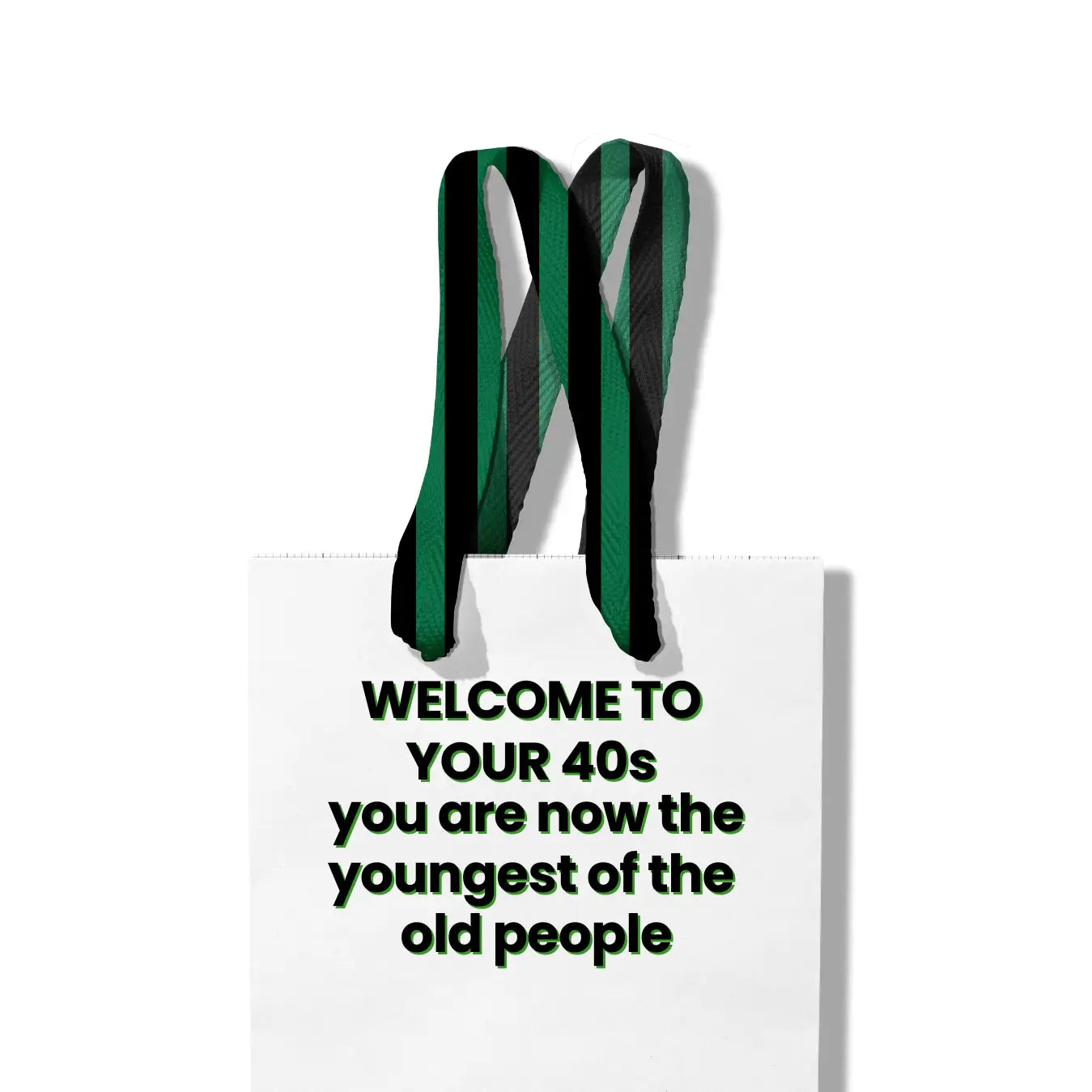 When the gift bag IS the card.Midlife crisis never looked so fun. These bold birthday bags say what everyone’s thinking (but funnier). Colorful + fun-perfect for stationary, gift wrapping, and birthday gift sections Made in the USA with exclusive stripe ribbon handles (imported) Size: 8x10x4