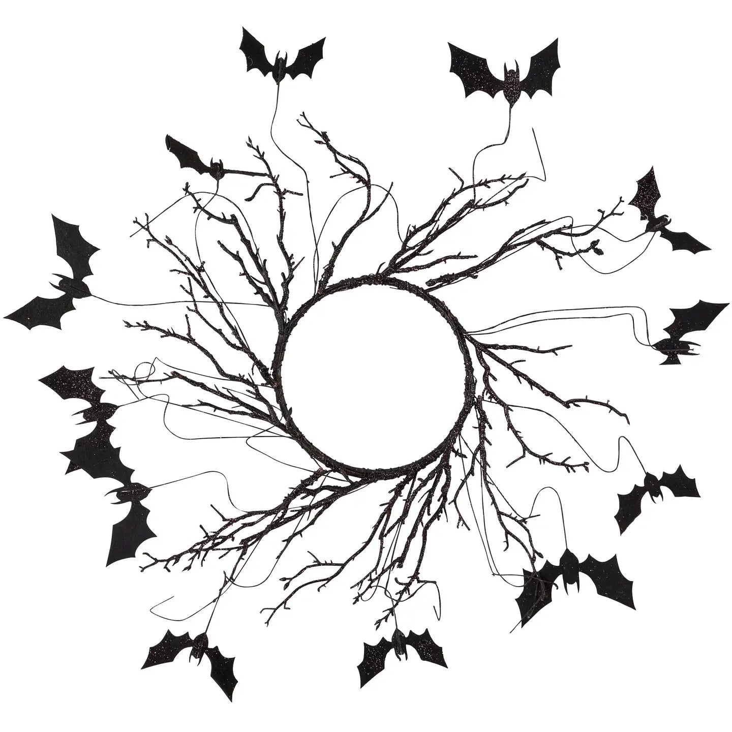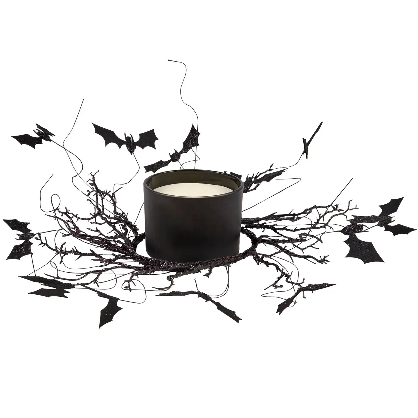 Add a spooky touch to your Halloween décor with this playful Halloween Bat Candle Ring. Featuring a ring of withered branches adorned with charming bat accents and a shimmering purple glitter finish, it perfectly complements any seasonal setting. The 4.5-inch center space fits a variety of candles (not included), making it a versatile and fun accent for your festive home.