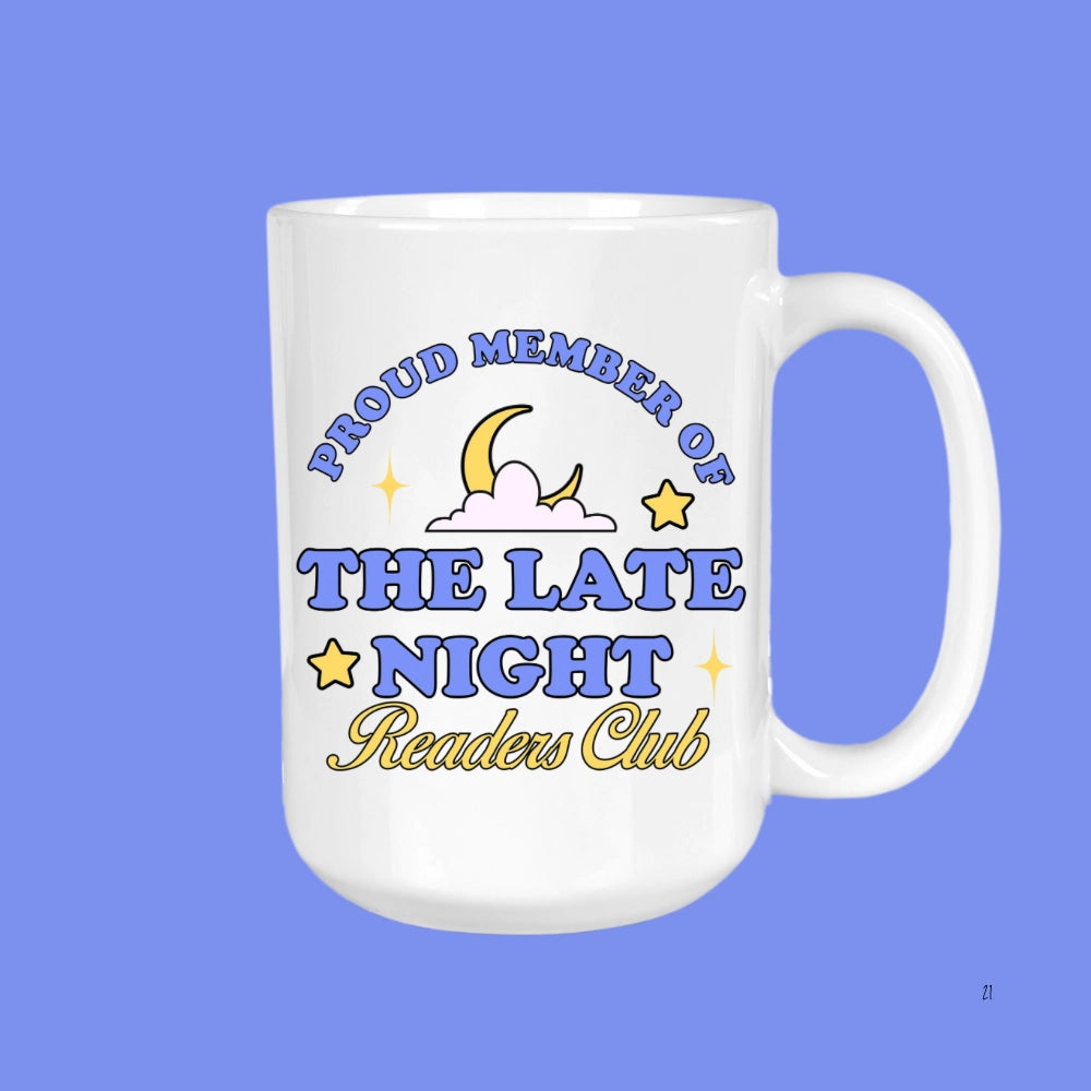 Enjoy your favorite late-night reads with this 15 oz ceramic mug, featuring a playful "Proud member of the late night readers club" graphic in cheerful blue and yellow. Dishwasher and microwave safe, it’s perfect for cozying up with coffee or tea during those quiet reading hours. Proudly printed in the USA, this mug adds a fun touch to your reading routine..