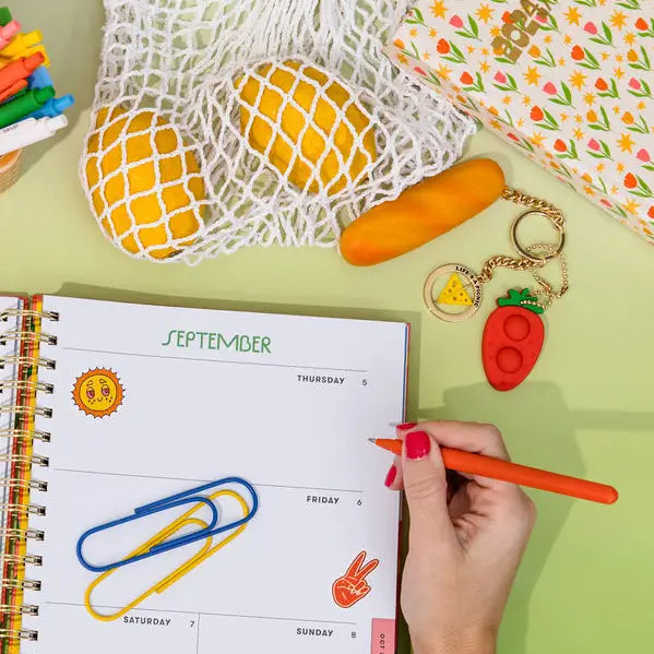 Eat your heart out, all other keychains! This one comes with a strawberry pop-it fidget, a cheese spinner fidget, and a baguette de-stress ball.