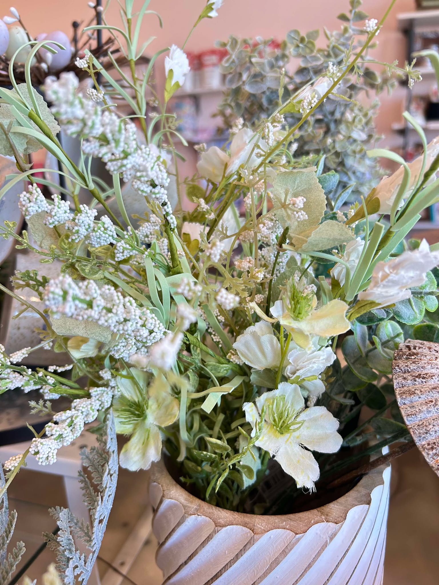 Get ready to add a breath of fresh air to your spring decor with the Misty Morning Pick! This 18" floral pick features beautiful white flowers and light green foliage, bringing a touch of nature into your home. Perfect for any arrangement or centerpiece, it's the perfect addition to your seasonal display.
