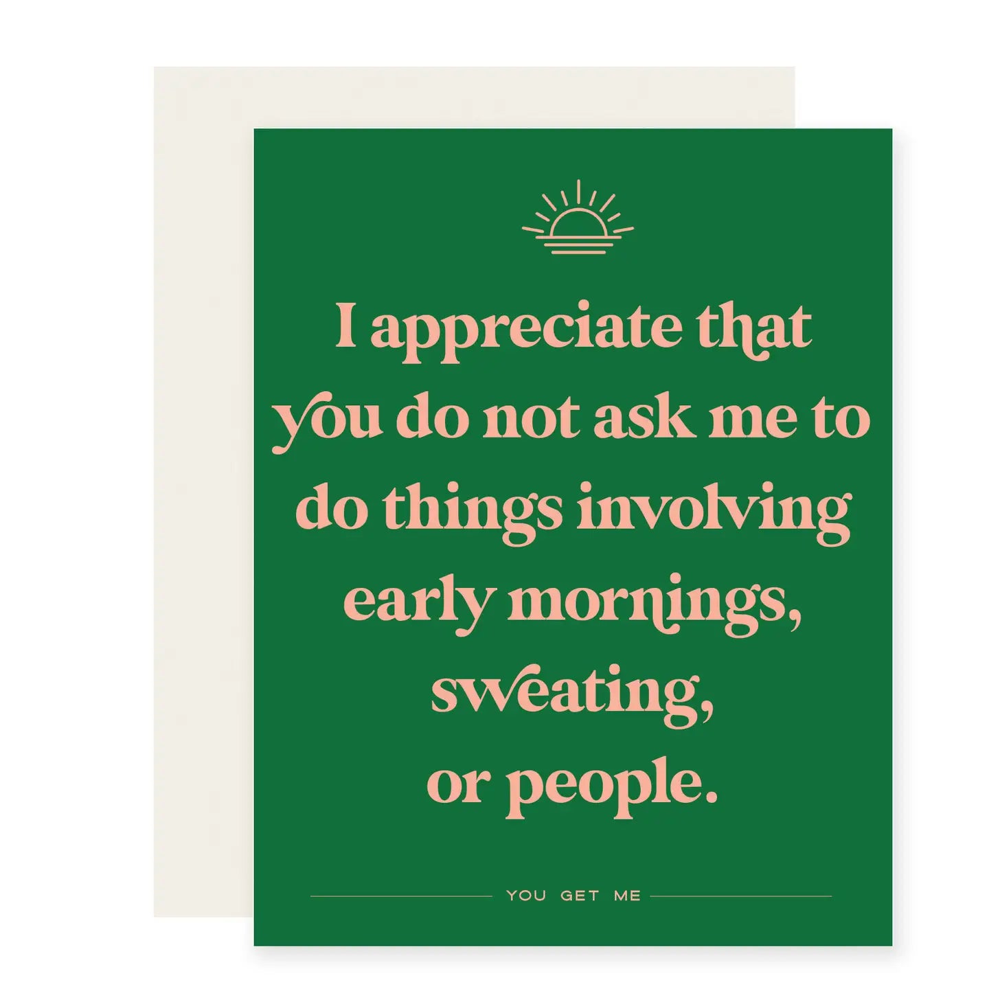 The perfect card for someone who gets you... because they know early mornings, sweating, and people just aren't your thing!