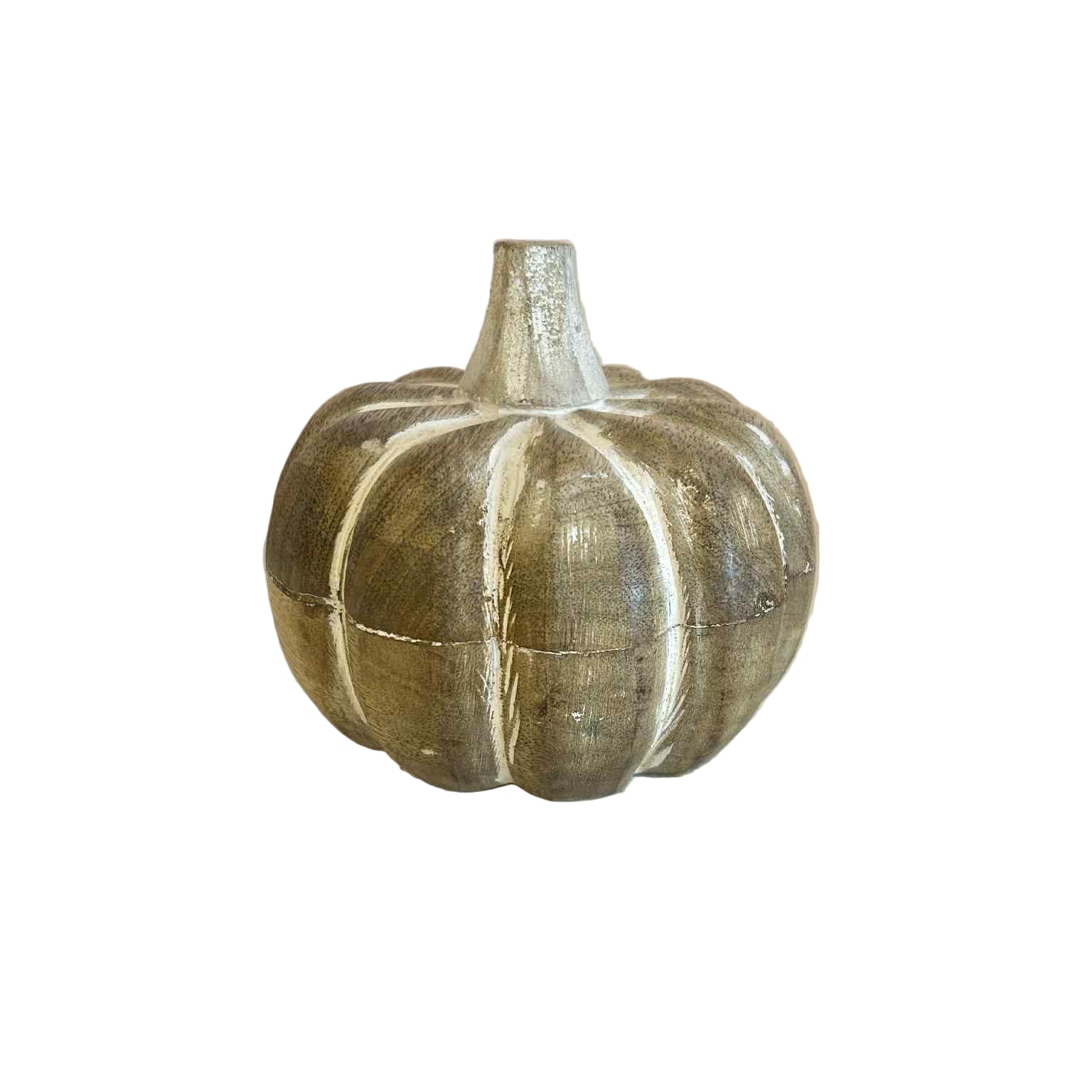 Celebrate the cozy vibes of fall with this charming 5-inch whitewashed mango wood pumpkin. Handcrafted in India, its rustic finish adds a touch of natural warmth and whimsical charm to your seasonal decor. Perfect for tabletops, shelves, or as part of your harvest display, this little pumpkin brings playful autumn spirit wherever it rests.