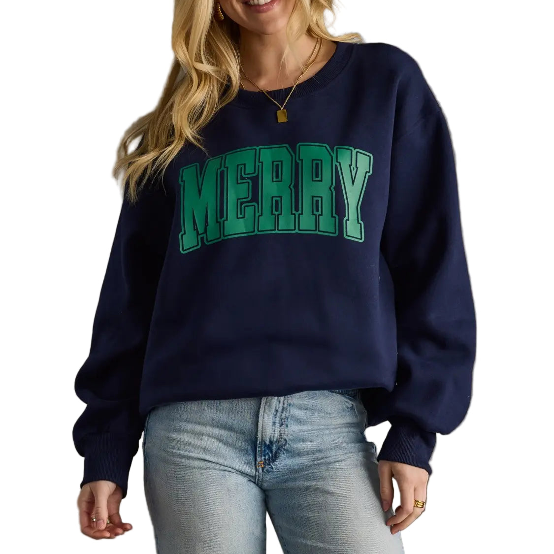 Wrap yourself in cozy comfort with this navy sweatshirt featuring a cheerful "Merry" message in textured green lettering across the front. The perfect blend of 50% polyester and 50% cotton keeps you warm without the bulk, making it ideal for layering or wearing solo. Whether you're spreading holiday cheer or just keeping things light and fun, this piece brings a smile-worthy vibe to your everyday rotation.