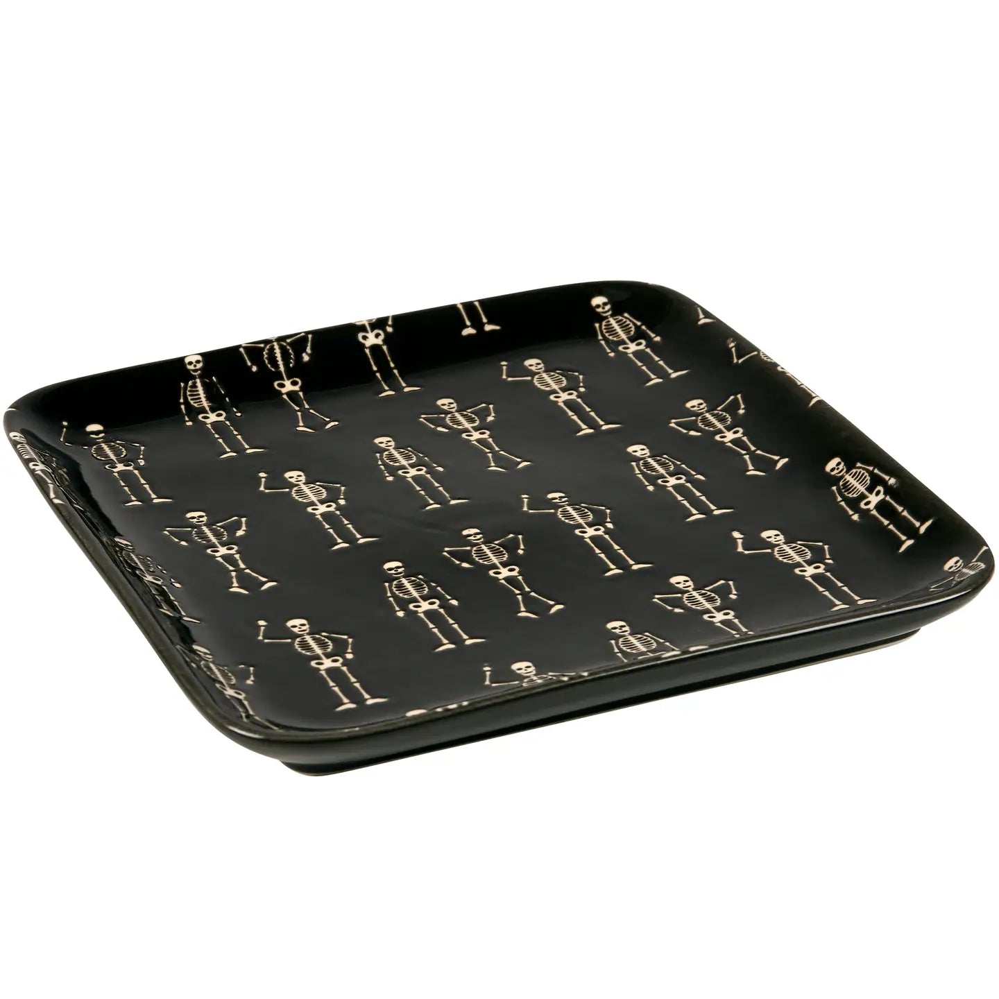 Add a spooky touch to your seasonal gatherings with our Skeletons Tray. Crafted from durable stoneware, this glossy black tray features playful debossed skeleton designs inside. It's microwave, dishwasher, and food safe, making it both fun and practical for serving treats or snacks during Halloween festivities.