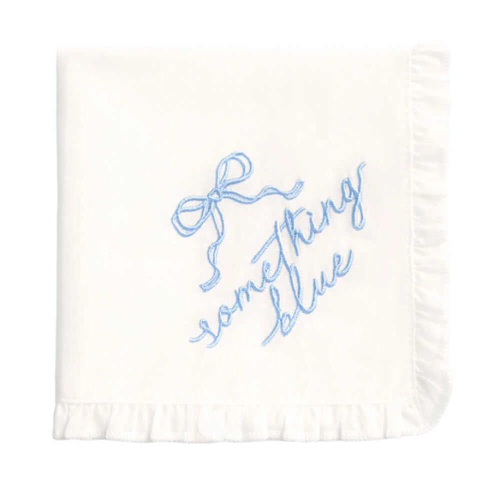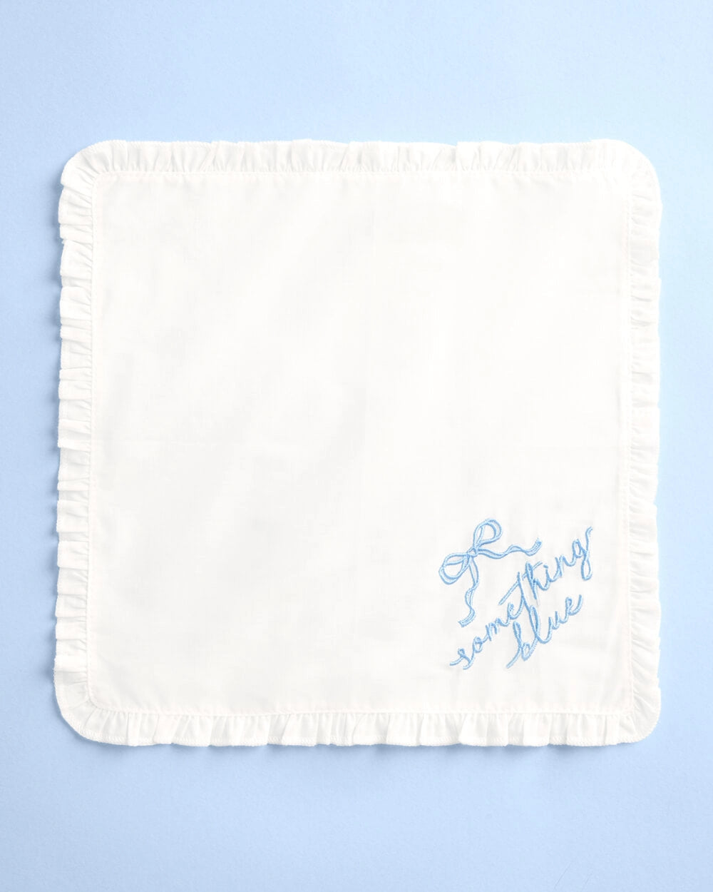 White handkerchief with blue embroidered "something blue" logo ,with a dainty bow